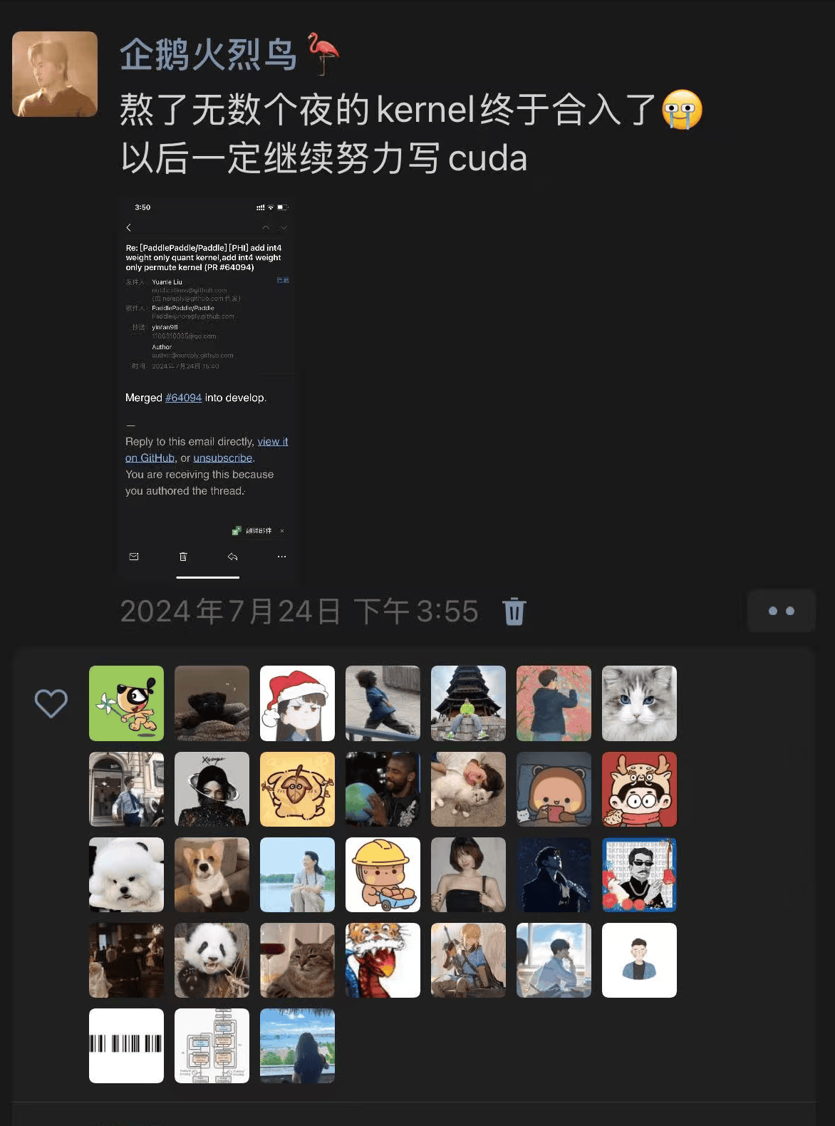 当时我记得最清楚的,是我花了整整三个月写一个 int4 量化的 CUDA 算子。每天晚上下班回家边学边写一直到凌晨四点,睡几个小时再去上班,这样的状态持续了一两个月。这个任务难在两点:一是没人做过,开源社区里找不到任何参考,我写的可能是社区第一份实现;二是我确实这方面掌握的不是特别深,很多先进的工具都不会用。最后是靠热情一点点啃下来的。写完那天我太激动了,还特地发了个朋友圈。